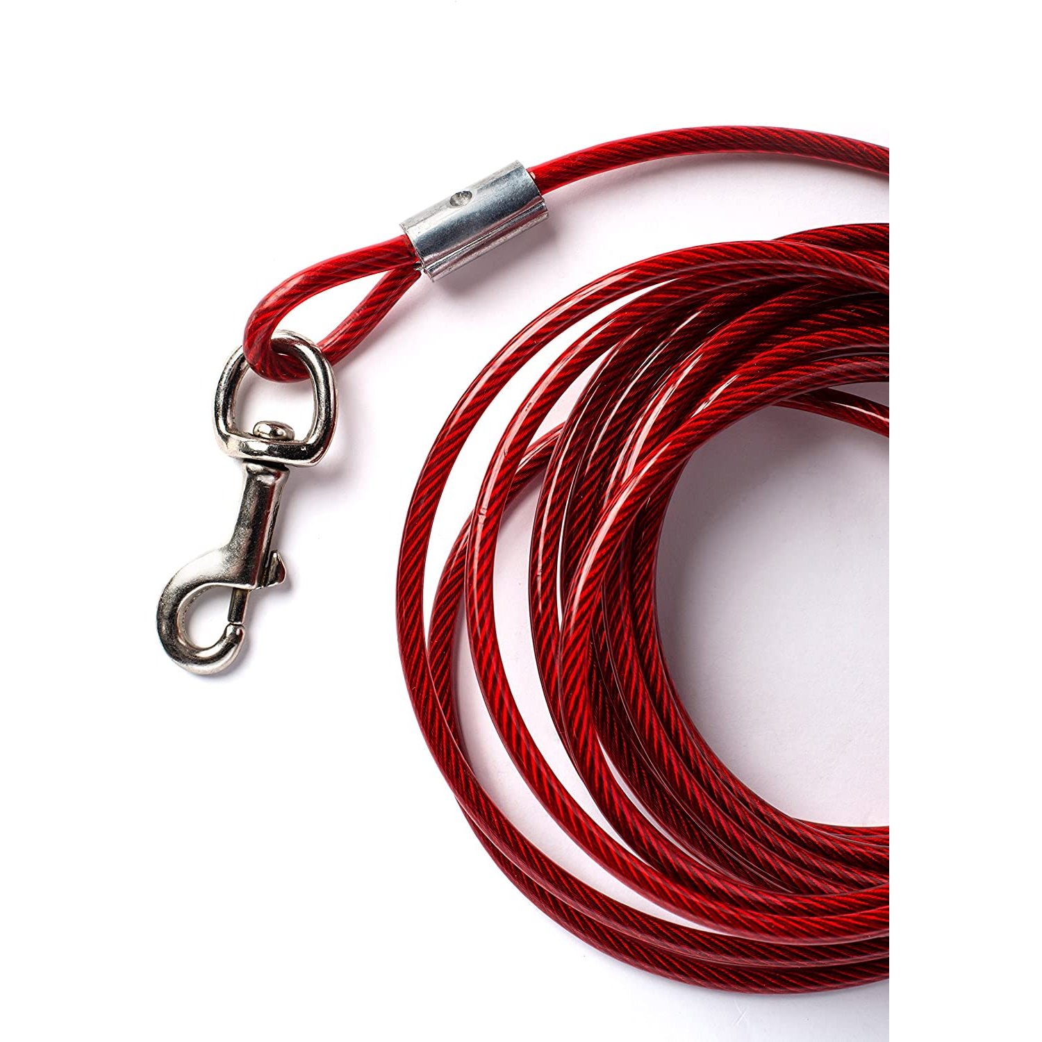 Prevue Pet Products medium-duty 10Æ tie-out cable 2118 is designed for dogs up to 65 lbs. Medium duty, galvanized aircraft-grade wound-steel cable is housed within crack-resistant, high visibility Red vinyl casing to ensure your dog stays safe and secure. Premium quality die-cast iron swivel bolt snaps at both ends to connect easily. Medium duty tie out cable is 10 foot long with a 3.3 mm diameter wire cable; 4.8 mm in vinyl casing.