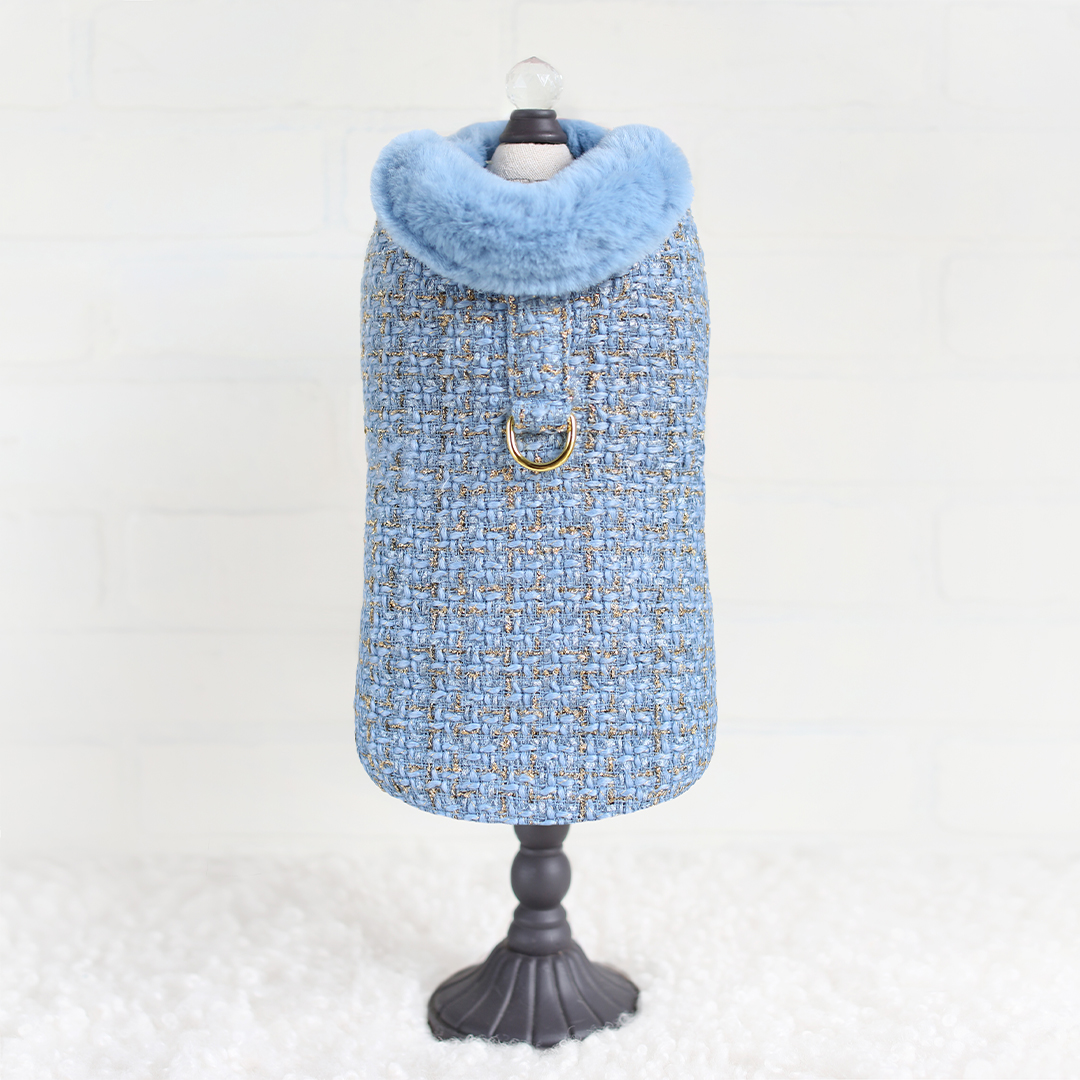 Your precious pooch will look regal in the Chantel Tweed Dog Coat by Hello Doggie. Our new coat collection was released just in time for the fall/winter season. When designing this coat we had the pooch in mind, our fur babies get cold too while they're out on the town for holiday shopping or a walk in the park. The coats are made from a beautiful soft tweed fabric and are lined with faux fur for a timeless design  and to keep out that extra chill. These coats are perfect to pair up with your favorite Hello Doggie sweater, featuring adjustable velcro straps for a perfect fit when adding layers. It is easy to care for, delicate wash with no softener or bleach and air dry. Our coats are fashionable and most importantly comfortable to wear. Each Coat has a matching harness, sold separately. Limited Edition MSRP $84.00 * Coats are handmade sizes may vary slightly. Made in USA.