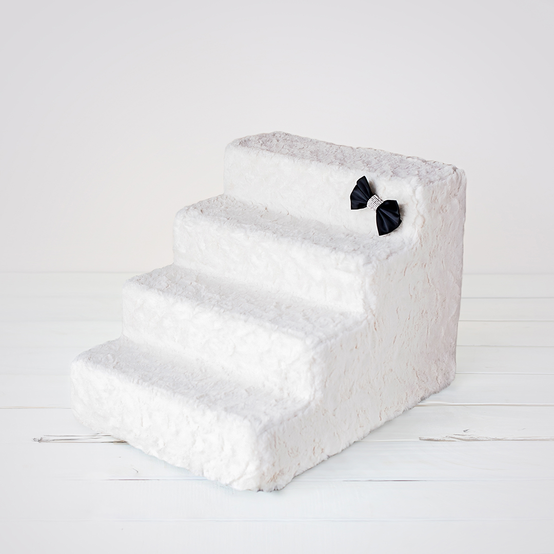 Luxury Pet Stairs handmade by Hello Doggie, covered in soft and silky luxurious fabric with a removable satin crystal bow to add a royalty feel to your home! Perfect to help your pet with a boost around the house for high couches and beds for safety and comfort to spend more time with Mommy and Daddy! High-density foam provides the perfect balance of stability and support. With a removable covered zipped up to perfection, these pet stairs can be washed and re-zipped back for a nice clean look every time! Gentle Wash, Tumble Dry low. Approximate Measurements: 4-Step - 22 1/4" L x 17 7/8" W x 16" H 6-Step - 33" L x 17" W x 24 1/4" H Each individual step measures 4" high and 5 3/4" deep MSRP - 4 Step $338   |   6 Step $480.00 * Stairs are handmade, sizes may vary slightly. Made in USA.
