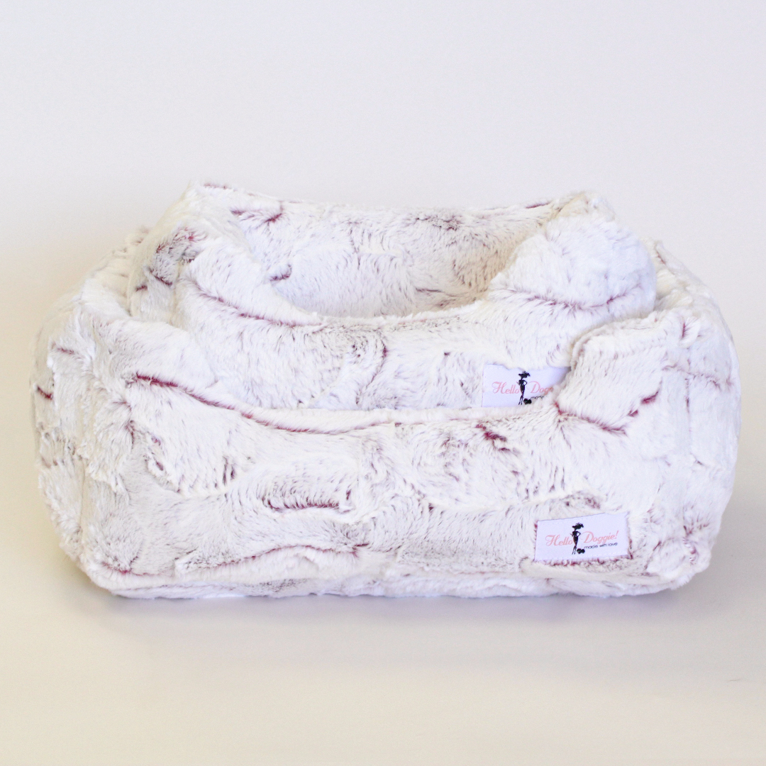 The Whisper Collection by Hello Doggie features high-quality soft fabric dog beds. This bed features a white fabric with a fluorescent tone peeping through. These soft-to-the-touch beds will have your pup snoozing away and cuddly wrapped in an ultra-soft matching dog blanket.  Dimensions Small Bed - 10" x 7"    |    For dogs up to 4 lbs MSRP - $99.99 Large Bed - 14" x 10"  |     For dogs up to 10 lbs MSRP - $119.99 *Bed is handmade and sizes may vary slightly. Made in USA.
