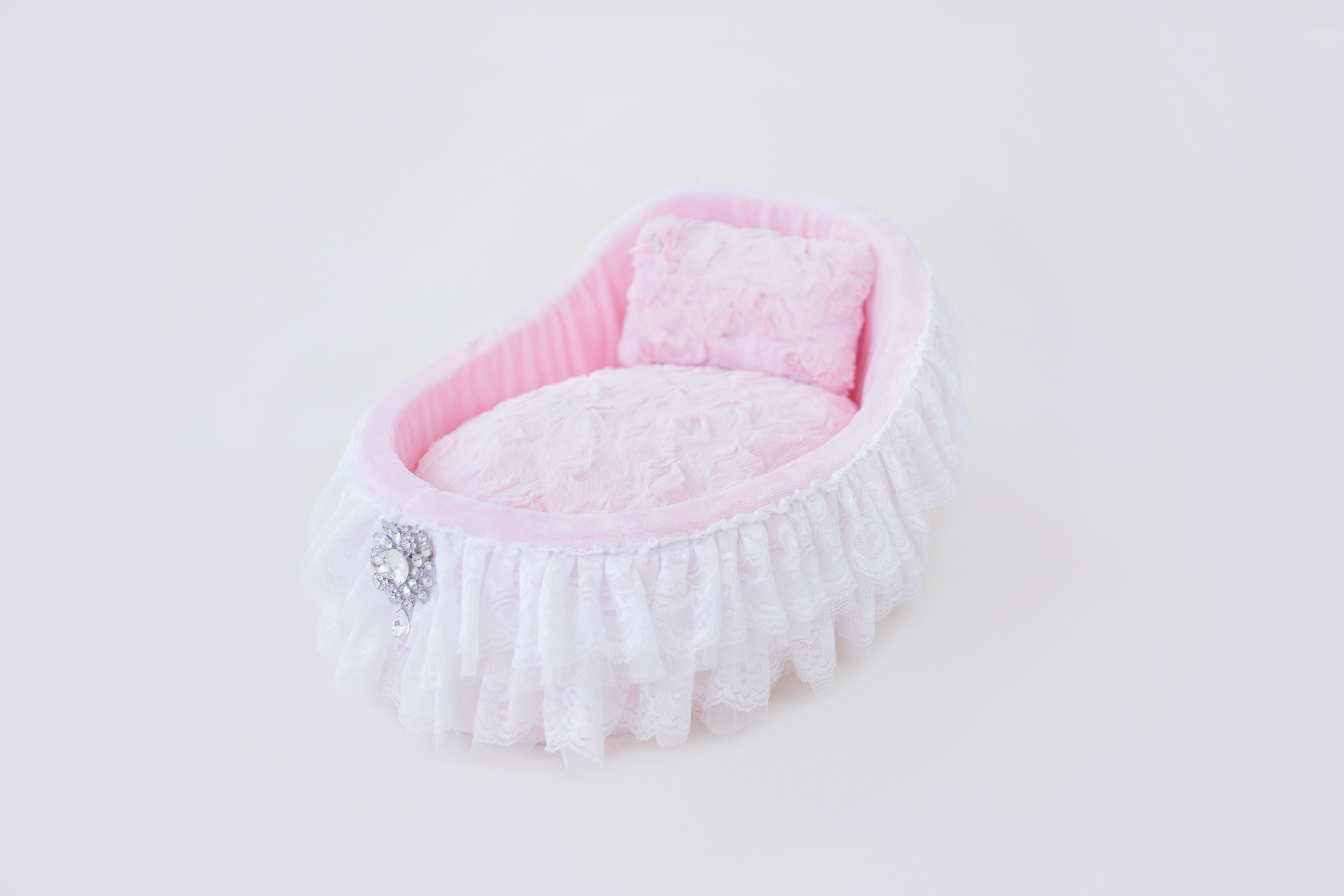 For that beautiful addition to your family, you'll want your pup to have sweet beginnings in our adorable Crib Bed by Hello Doggie, to lull your baby into sweet dreams. Trimmed in two-tiered romantic handmade lace, our cribs also feature a bouquet drop crystal brooch and removable pillow for easy care. Pair with any Hello Doggie Blanket. You'll be the envy of all your friends! Our collection offers four soft colors to choose from. One Size - *20" x 14" x 5 1/2"   |   Pillow inside - 18" x 12"   |   For dogs up to 6 Lbs MSRP - $177.99 *Bed is handmade and sizes may vary slightly. Made in USA.